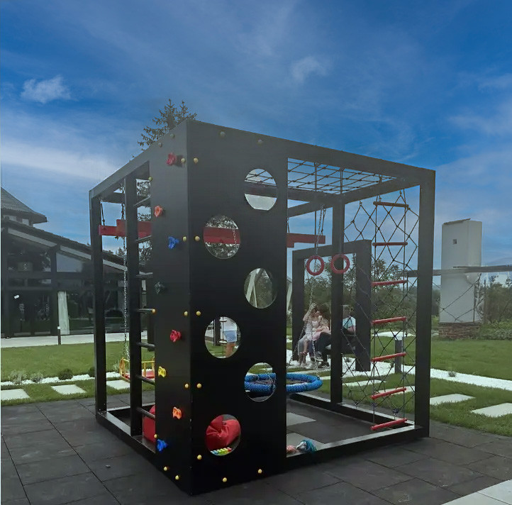 Куб – це конструкція у вигляді кубу і водночас це модульний вуличний спортивний комплекс для дітей різного віку. Його основна перевага – універсальність: можна використовувати як спортивний тренажер і як ігровий майданчик для усієї родини, можна у будь-який час додавати нові елементи типу гірка, баскетбольна корзина, гойдалка, канатні елементи ігрові чи гімнастичні тощо. Комплекс ідеально підходить як для приватного подвір’я, так і для садочків, шкіл та дворів у сучасних багатоповерхівках.